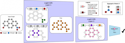 LogiX-GIN est un modèle novateur de Graph Neural Network (GNN) conçu pour rendre les décisions des modèles sur graphes directement interprétables sous forme de règles logiques. Contrairement aux approches post-hoc, LogiX-GIN intègre l’explicabilité au cœur même de son architecture, garantissant que les explications sont fidèles aux calculs internes du modèle. Les résultats expérimentaux montrent que, contrairement aux autres approches auto-explicables qui se limitent à identifier la partie la plus importante de l’entrée, LogiX-GIN fournit des règles qui expliquent son fonctionnement couche par couche. Et malgré les contraintes imposées à l’architecture pour garantir cette explicabilité, il atteint des performances comparables à celles des modèles “boîte noire”. L’introduction de LogiX-GIN ouvre de nouvelles perspectives pour l’usage des GNN dans des domaines où la confiance et la transparence sont essentielles, comme la biologie computationnelle, la chimie ou les systèmes de décision critiques.