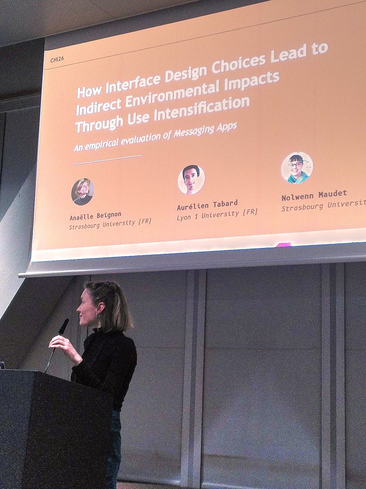 The paper “How Interface Design Choices Lead to Indirect Environmental Impacts Through Use Intensification: An empirical evaluation of messaging apps”, written as part of a joint PhD with the University of Strasbourg, received a best paper honourable mention award.